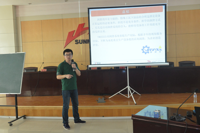 在9月7日举行的润滑专业技术培训中,广州机械院设备润滑与检测研究所所长、润滑工程技术中心首席专家贺石中亲临授课现场,围绕“润滑管理”理念讲了第一堂课。在随后的2天里,设备润滑与检测研究所副总工程师冯伟;设备润滑与检测研究所马红军等讲师正式授课。此次培训润滑工程技术中心首先派专家对山水典型生产线进行现场诊断,培训课程理论联系实际,具有较强的实践性和指导性。9月10日,壳牌石油专业人员贾碧康、老鹰润滑油专业人员王云明分解介绍了壳牌石油产品和空压机润滑知识。9月11日,重庆重齿机械有限公司专业人员庞洪斌介绍了立磨、水泥磨、辊压机等大型设备附属减压及的管理和维护技巧。9月12日,兰州电机股份有限公司和山东泰开电气集团有限公司的专业人员分别介绍了电机和变压器的专业知识。