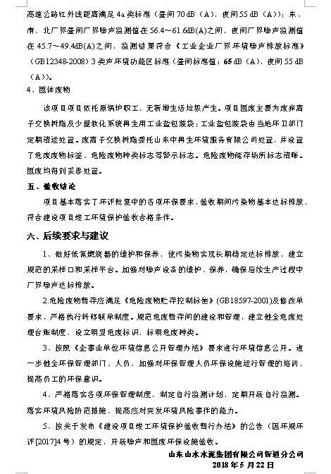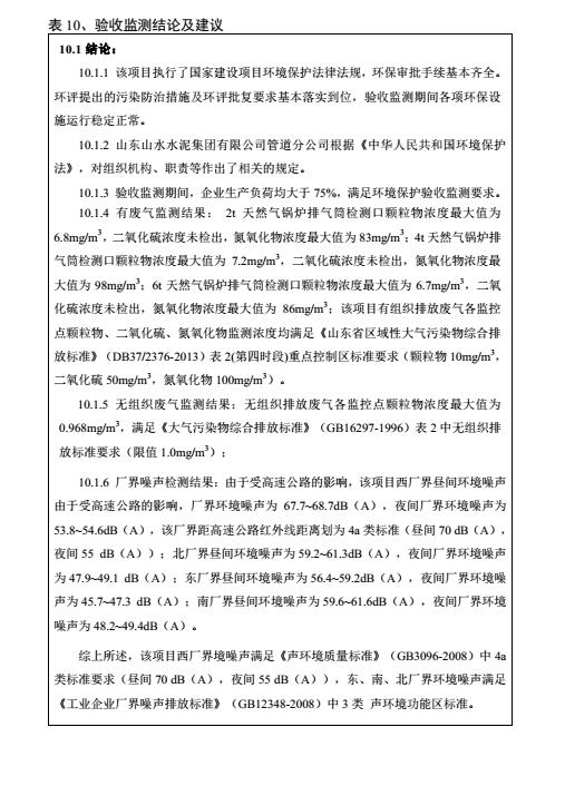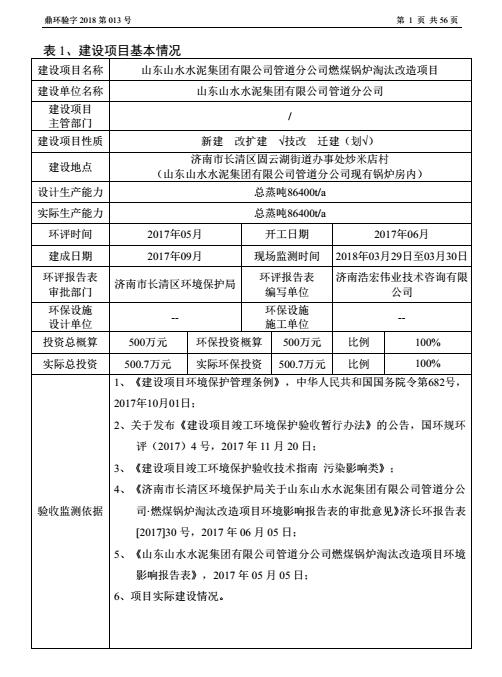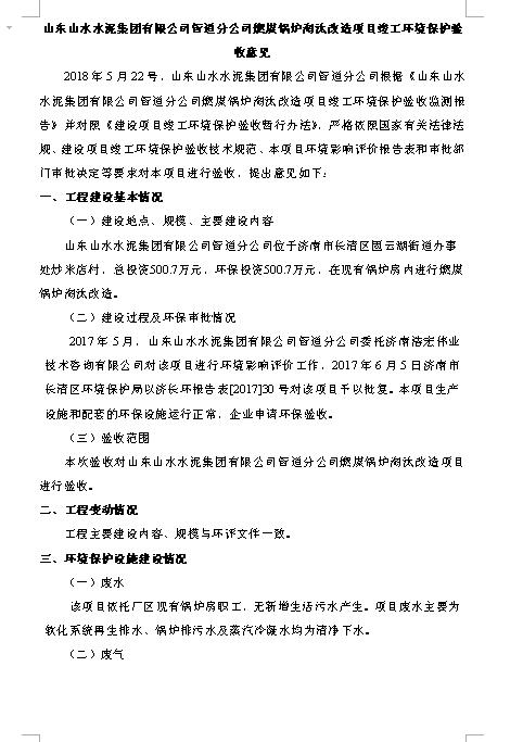2018年5月22号,山东山水水泥集团有限公司管道分公司根据《山东山水水泥集团有限公司管道分公司燃煤锅炉淘汰改造项目竣工环境?;ぱ槭占嗖獗ǜ妗凡⒍哉铡督ㄉ柘钅靠⒐せ肪潮;ぱ槭赵菪邪旆ā罚细褚勒展矣泄胤煞ü?、建设项目竣工环境保护验收技术规范、本项目环境影响评价报告表和审批部门审批决定等要求对本项目进行验收。